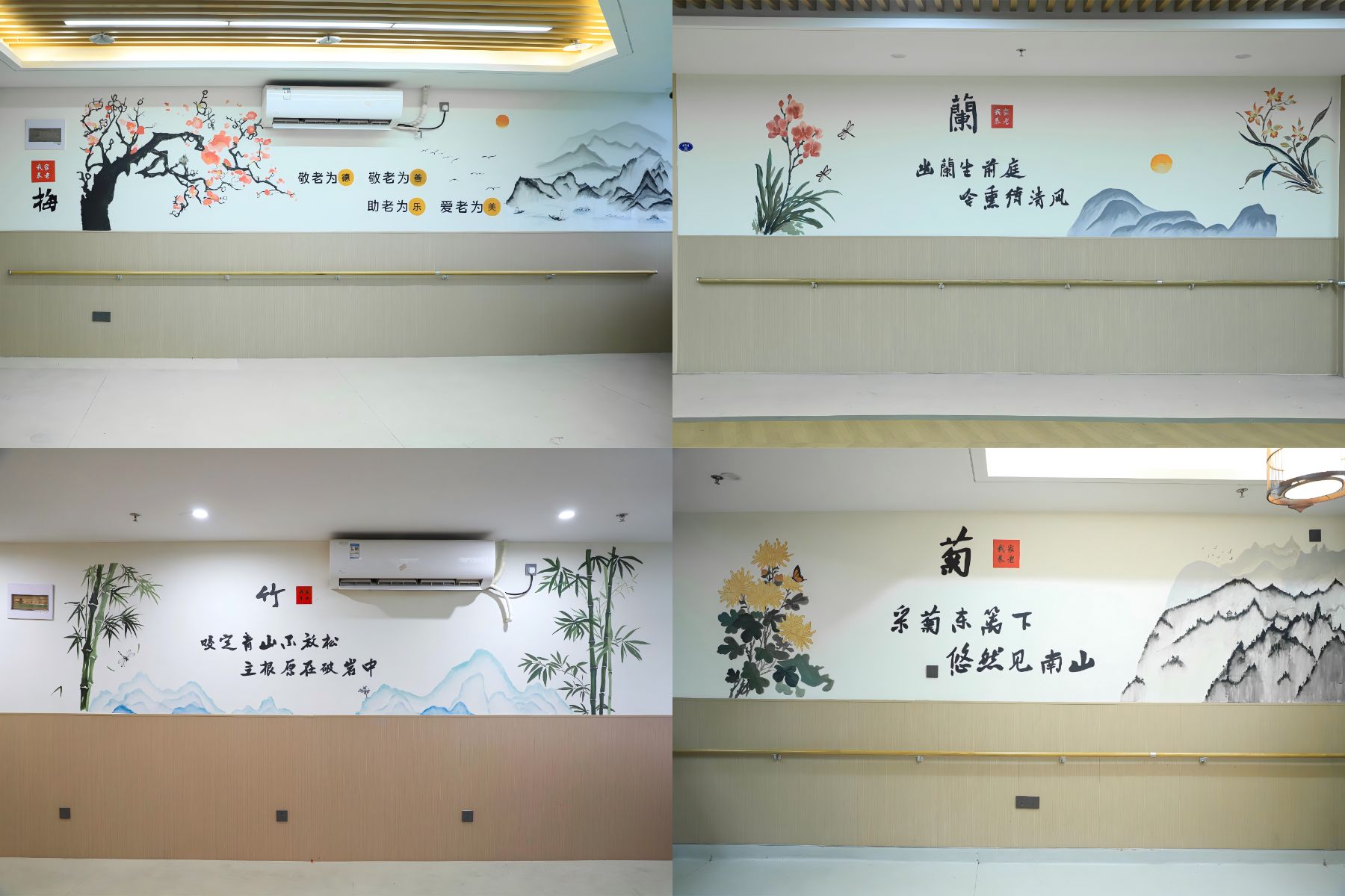 實踐隊選取了中華優秀傳統文化中極具代表性和精神象征意義的“花中四君子”——梅、蘭、竹、菊作為墻繪創作主題。梅的凌寒傲雪、蘭的清幽高潔、竹的虛心勁節、菊的淡泊隱逸,不僅承載著深厚的文化內涵,也寄托了對長者高尚品格與美好晚年的禮贊。