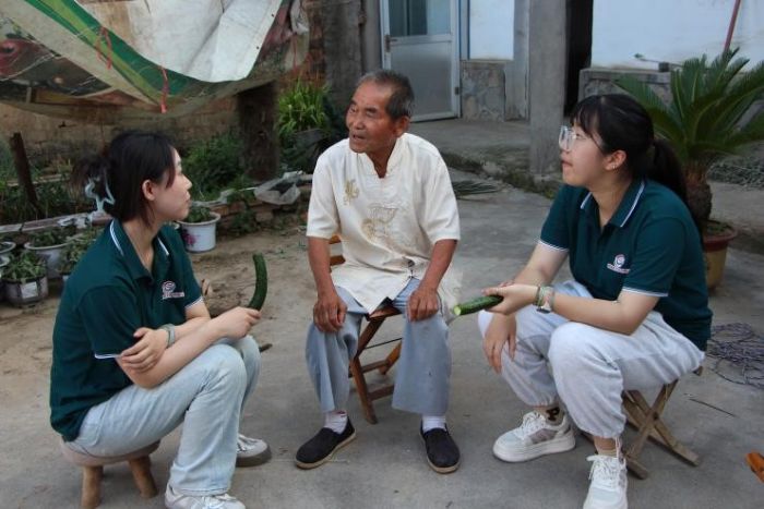 圖為“紅心潤(rùn)心團(tuán)隊(duì)”在和村聽(tīng)老支書(shū)講述“和村蘋(píng)果”的發(fā)展歷程