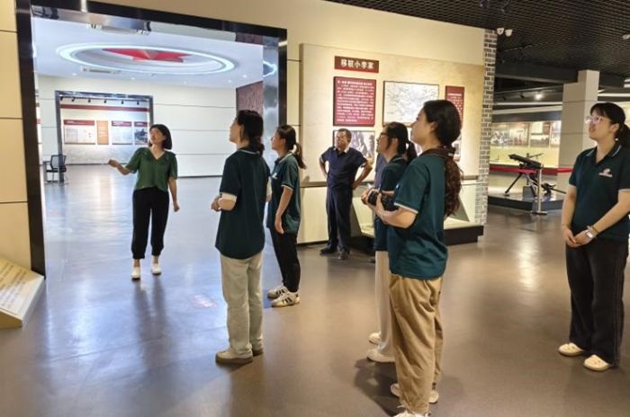 圖為“紅心潤(rùn)心團(tuán)隊(duì)”在小李莊紀(jì)念館聽(tīng)紅色講解員講述淮海戰(zhàn)役史