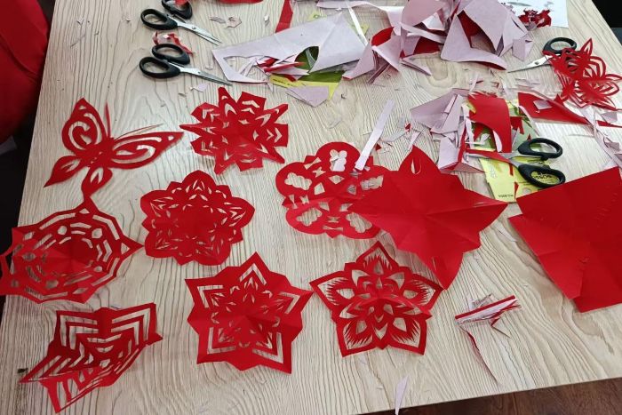 圖為團隊成員在非遺傳承人的指導下完成的剪紙作品。 王嘉琪 供圖