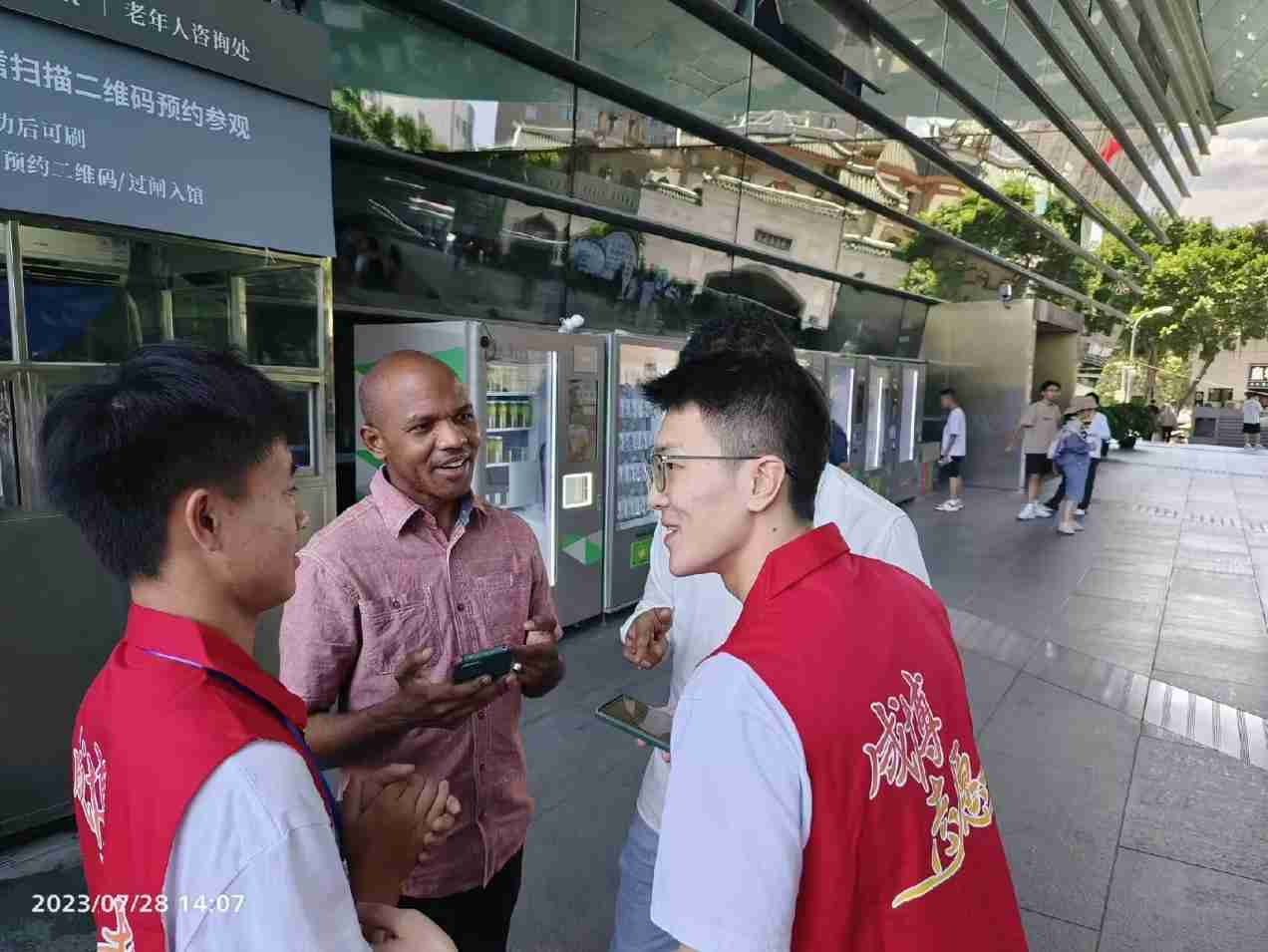 愛益陽光赴成博社會實踐隊分配了兩名隊員在博物館門口接待外國友人,雖然跟外國人對話看似很難,但同學們顯然已經做好了充足的準備。他們開始之前已經積累了博物館回答問題所需要的相關單詞和短語,并且也下載了相應的同聲傳譯APP,可謂是兩手準備,萬無一失。他們洋溢著笑容,充分展示著中國青年的自信,熱情的與來自外國的參觀者對話,耐心的回復著他們的問題。外國朋友也很滿意,開心的笑著。這也許就是中國青年志愿者,對待志愿服務熱心積極,不分國界,充分展示著當代中國青年的形象。