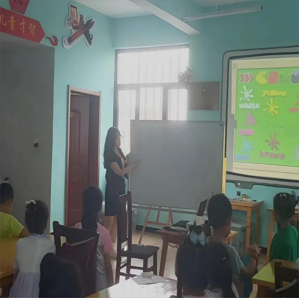 在明亮而溫馨的教室里,志愿者張澤文正站在白板前,給一群活潑可愛的孩子們講解英語。孩子們圍坐在她的周圍,眼睛里閃爍著好奇和渴望的光芒,她耐心地解答著每一個孩子的疑問,不斷鼓勵著孩子們。