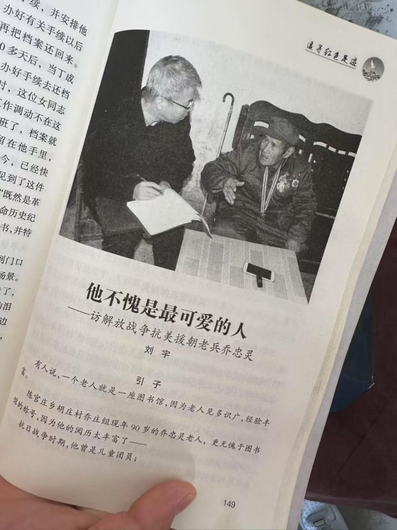 為深入探尋紅色記憶,我們團隊成員分為兩隊開展尋訪。我所在的小隊四人懷著敬意,走進95歲淮海戰(zhàn)役老將士喬忠靈家中。喬老鄭重地取出珍藏的軍裝和徽章,翻開《追尋紅色足跡》第一卷第149頁,“最可愛的人”字樣映照出往昔的輝煌。談及征戰(zhàn)歲月,他目光深邃:“淮海戰(zhàn)役時,我們面對敵人的飛機大炮,奮力搶占陣地,戰(zhàn)壕被炮火反復摧毀,許多戰(zhàn)友剛到前線就獻出了生命。糧食匱乏,大家只能依靠炒面和凍土豆果腹,飲用融雪水維持生命,但無人抱怨——解放全中國的信念,比任何困難都更強大。”