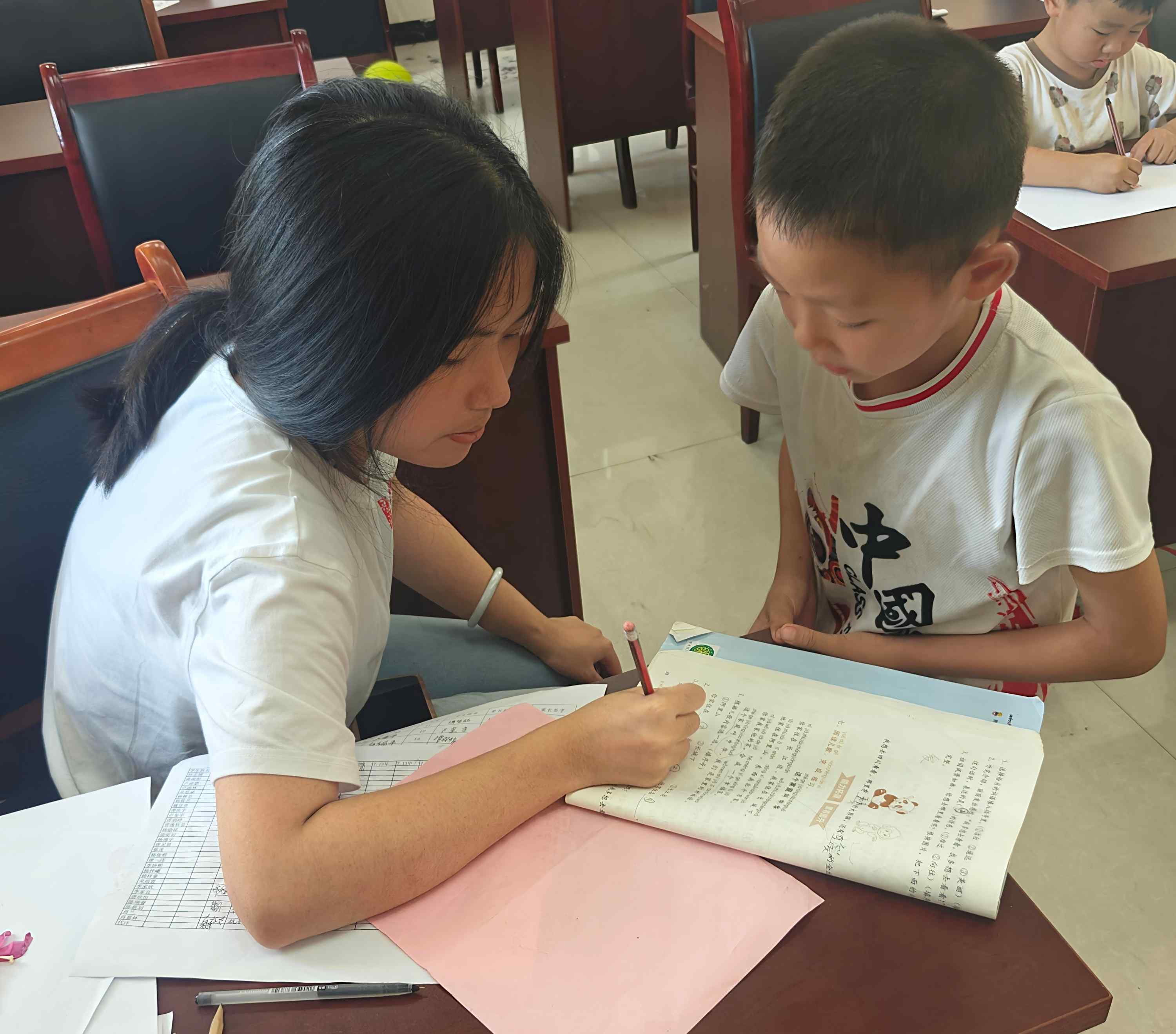 課業輔導課上,隊員們專注幫孩子們攻克暑假作業中的難題。沒有復雜的文化延伸,只有耐心的講解和反復的鼓勵,這種純粹的陪伴,讓孩子們漸漸放下拘謹:內向的女孩會悄悄把畫好的小紙條塞給老師,調皮的男孩會在解題后得意地說 “老師你看我厲害吧”。正是這份無距離的互動,讓師生之間的信任悄然生長。