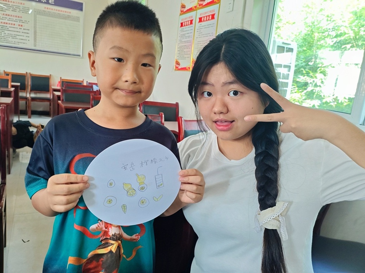 圖2美術課后孩子拿著“檸檬”與志愿者合影。盧婷 供圖